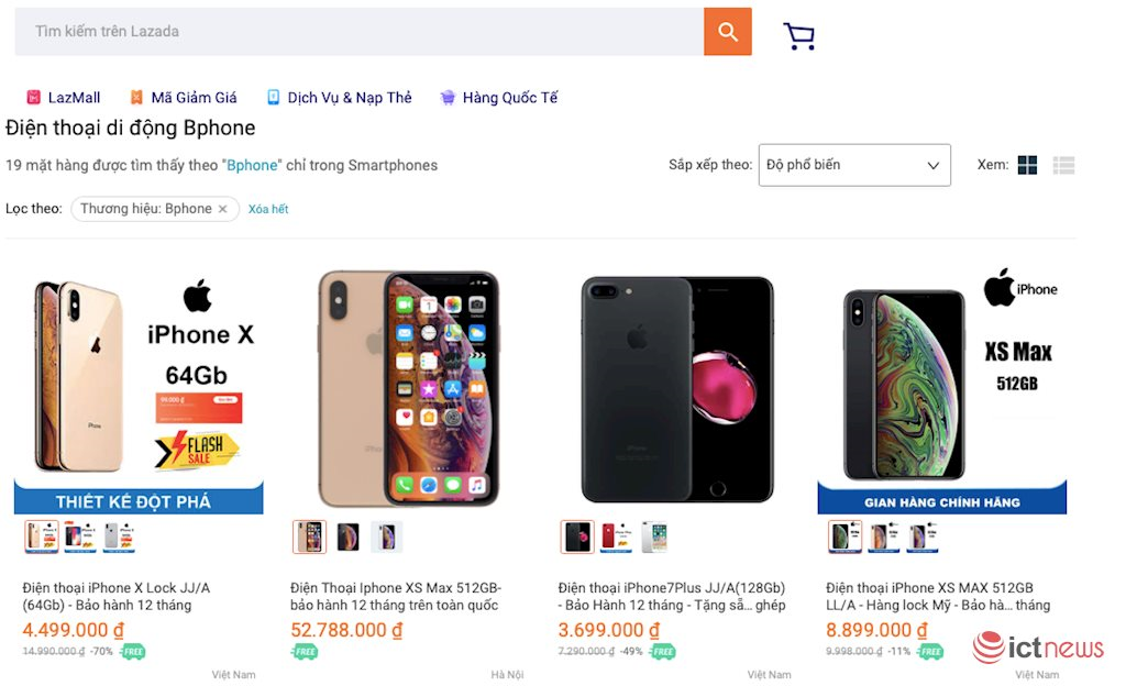 Khi vào mục thương hiệu Bphone trên trang bán hàng của Lazada, người dùng sẽ bắt gặp gần chục điện thoại… iPhone, bao gồm iPhone X, iPhone Xs Max, iPhone 8 Plus, iPhone 7 Plus,...