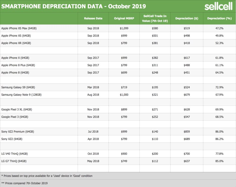 SellCell, website chuyên mua bán điện thoại cũ, sử dụng dữ liệu có được để đánh giá mức độ mất giá của iPhone, Galaxy, Sony, LG. Tương tự năm 2017, flagship 2018 của LG mất giá mạnh song tệ nhất lại là của Sony.