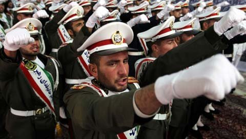 Các binh sĩ Iran hô các khẩu hiệu chống Israel và chống Mỹ trong một buổi lễ kỷ niệm tại lăng Khomeini ở Tehran ngày 1/2. (Ảnh: Getty)