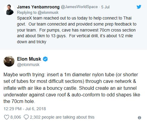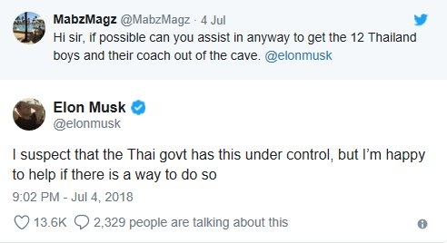 Đầu tiên, Musk đề xuất kế hoạch của mình trên Twitter qua tweet trả lời một lời kêu cứu từ tài khoản @MabzMagz, ông lịch sự nói rằng minh tin chính phủ Thái Lan đã có phương án giải quyết, tuy nhân vẫn sẽ vui vẻ giúp đỡ nếu được nhờ: