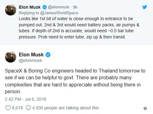Không chỉ đội ngũ của CEO Tesla, rất nhiều kỹ sư và đội cứu hộ lành nghề trên khắp thế giới đã đổ về Thái Lan để trợ giúp chính phủ nước này trong thời điểm khó khăn. Thời gian của cuộc giải cứu diễn ra vô cùng gấp rút bởi nước lũ và nước mưa vẫn không ngừng dâng cao tới hết cuối tuần, khiến khí oxy trong động liên tục giảm. Tại một số điểm cực hẹp, nước lũ còn tỏ ra hung dữ và vô cùng nguy hiểm ngay cả đối với đội giải cứu. Trước tình thế đó, tỷ phú Elon Musk đã ngỏ ý muốn được giúp đỡ với đội ngũ kỹ sư tài giỏi có chuyên môn cao trong lĩnh vực đào hầm và nguồn lực dồi dào của ông.