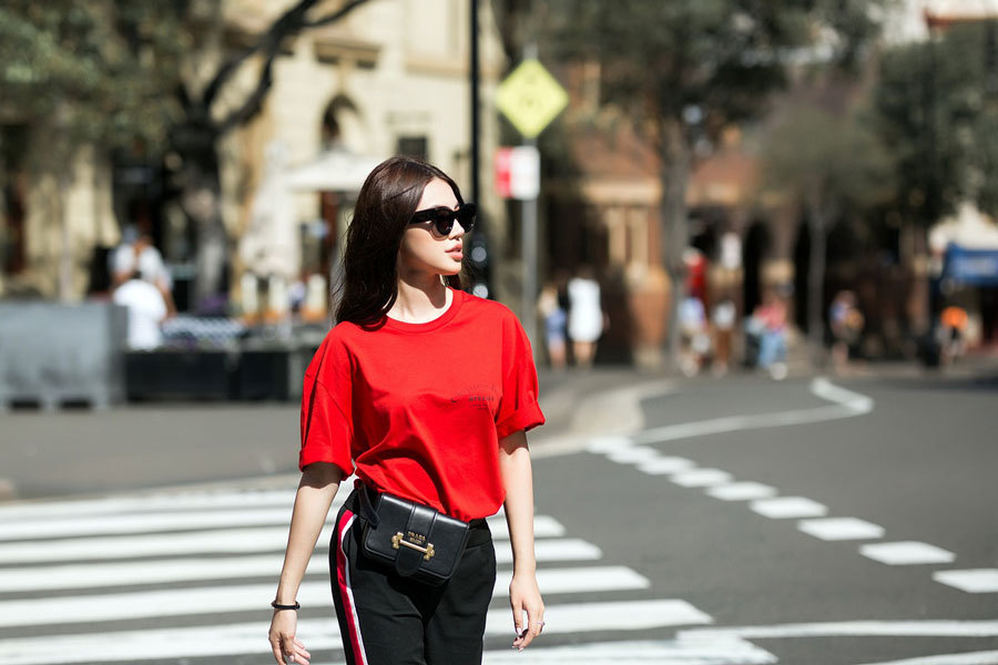 Cô tự tin xuống phố với những mẫu trang phục đơn giản, thoải mái nhưng cũng rất sành điệu. Chân dài nổi bật với phong cách thời trang ấn tượng khi xuất hiện trên đường phố Australia.