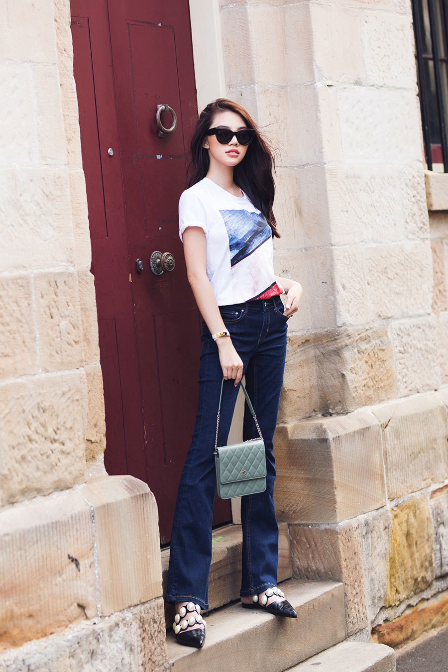 Áo sơ mi in hình đơn giản cùng quần ống loe khoe chiều cao trở thành lựa chọn ưu tiên của Jolie Nguyễn khi dạo phố trong những ngày hè. Hoa hậu thế giới người Việt tại Úc cho biết những chiếc quần với kiểu dáng đơn giản này vừa dễ phối đồ, vừa giúp người mặc tự tin, thoải mái hơn khi vận động. |