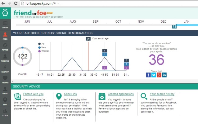 Đối với những người thích sử dụng các ứng dụng khác nhau để phân tích hoạt động của họ, Kaspersky Lab đã tạo ra một công cụ để thu thập số liệu thống kê về những hoạt động trên Facebook, Friend or Foe hiển thị bao nhiêu video và hình ảnh một người dùng đã đăng tải, số lượng like nhận được và rất nhiều những số liệu khác nhau mà các người dùng Facebook quan tâm. Friend Or Foe hiện đang có ngôn ngữ Anh, Nga, Đức, Pháp, Ý, Tây Ban Nha, Bồ Đào Nha, Mexico Tây Ban Nha, tiếng Ả Rập, và Nhật Bản. Kaspersky Lab hứa hẹn sẽ thêm vào các ngôn ngữ khác trong tương lai gần.