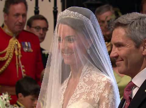 Kate mặc chiếc áo cô dâu được thiết kế rất tinh xảo, voan hai bên vai, ngực khoét sâu.