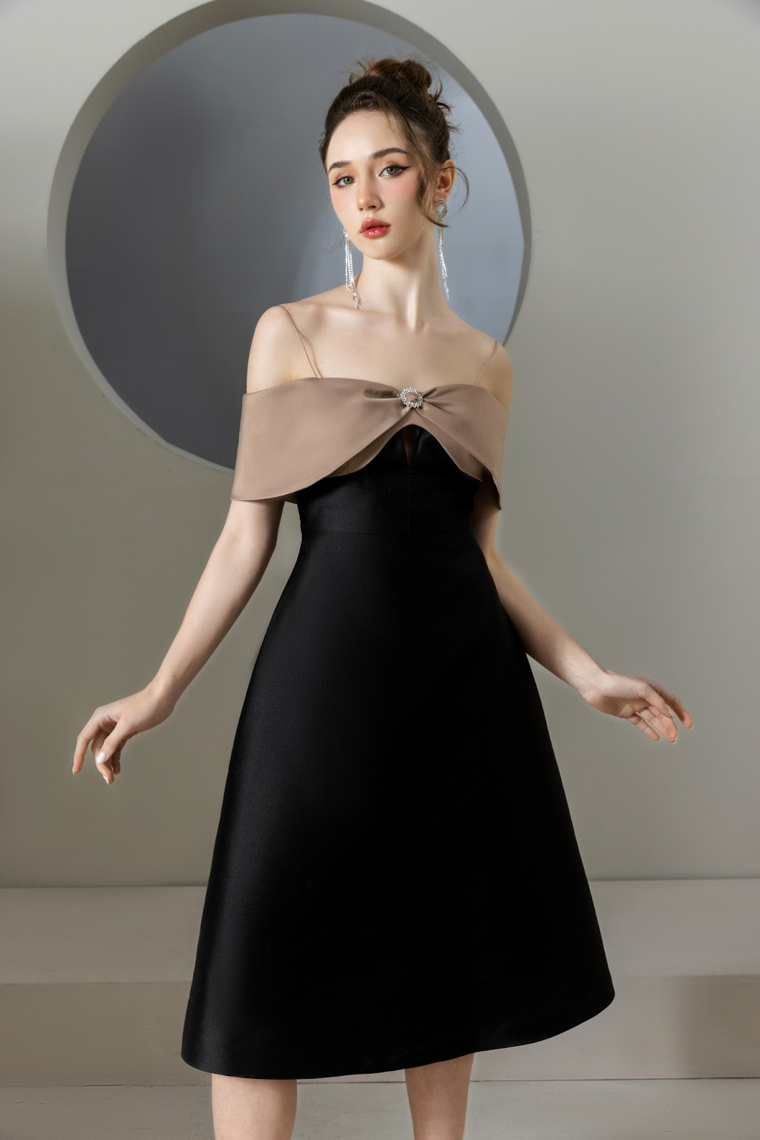 Trong bộ sưu tập váy đầm dự tiệc thu đông, váy dáng đầm xòe cổ yếm Keelin là một trong những mẫu nổi bật. Một mẫu váy không bị “đụng hàng” bởi thiết kế độc đáo. Chân váy xòe xếp ly nhẹ tạo dáng mềm mại và thướt tha. Tay thiết kế dập ly nhẹ nhàng cách điệu. Và điểm nhấn của váy là phần cổ yếm ấn tượng. Cổ yếm thiết kế cut-out khéo léo giúp khoe xương quai xanh một cách tinh tế. Đặc biệt, váy sở hữu màu xanh ngọc mát mắt.