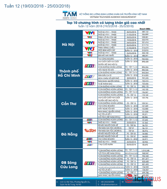 Vietnam TAM công bố số liệu rating Top 10 chương trình truyền hình ăn khách nhất đo lường theo hàng tuần. Cũng theo số liệu cho Vietnam TAM công bố, suốt trong thời gian từ tháng 1/2018 đến tháng 3/2018, không có một chương trình của nước ngoài nào được lọt vào Top 10 các chương trình ăn khách được công bố hàng tuần.