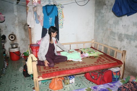 | Chị Hiên và cháu bé mới sinh torng gian nhà trọ chật hẹp. |