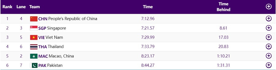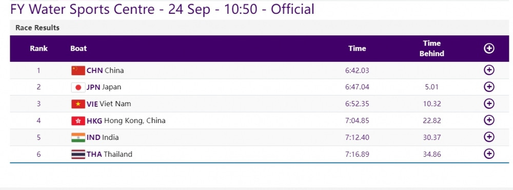 Như vậy kết thúc Asian Games 19, đua thuyền Việt Nam đã xuất sắc đoạt 3 HCĐ. Đây là thành tích đáng quý bởi các đối thủ của Việt Nam đều rất mạnh, đến từ nước chủ nhà Trung Quốc và các cường quốc trong châu lục.