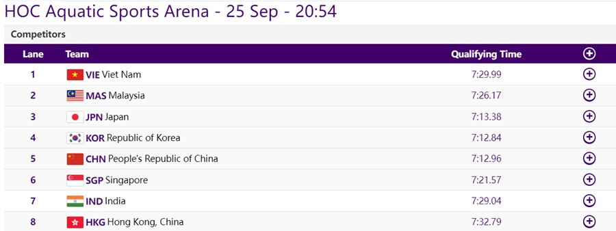 4 kình ngư Đỗ Ngọc Vinh, Ngô Đình Chuyền, Nguyễn Quang Thuấn và Trần Hưng Nguyên xếp thứ 7 ở vòng loại với thành tích 7 phút 29 giây 99 và lọt vào chung kết, diễn ra vào lúc 19h54 hôm nay. Đây là nội dung đầu tiên của bơi lội Việt Nam góp mặt ở chung kết ASIAD 19.