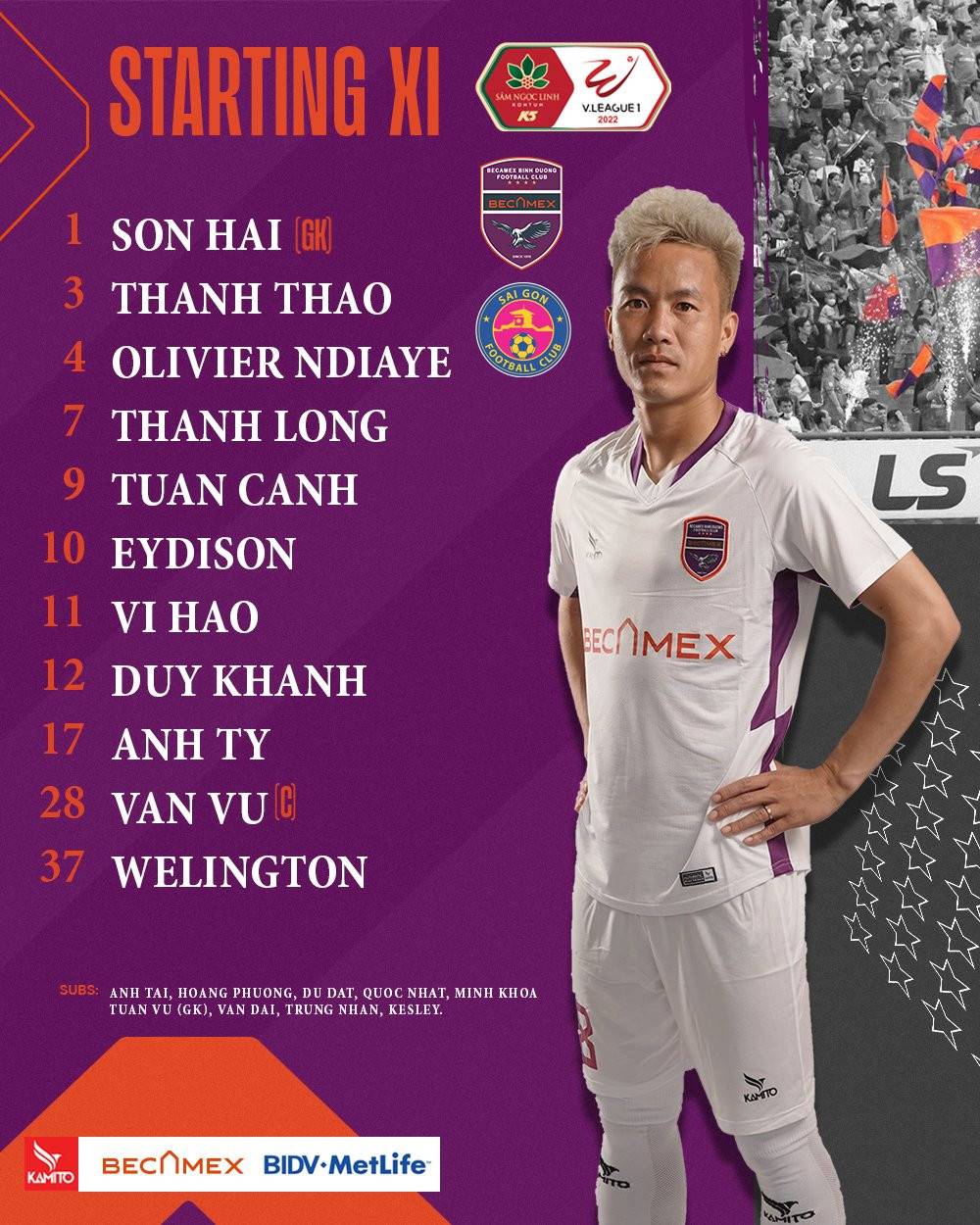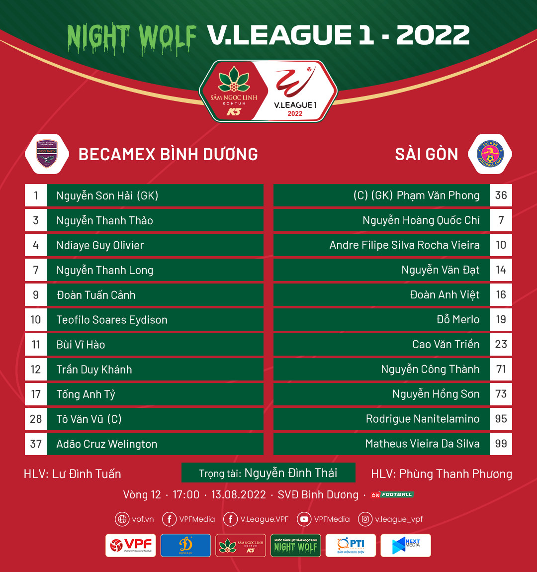 Bình Dương: Sơn Hải (thủ môn), Thanh Long, Thanh Thảo, Olivier, Duy Khánh, Anh Tỷ, Tuấn Cảnh, Văn Vũ, Eydison, Welington, Vĩ Hào.