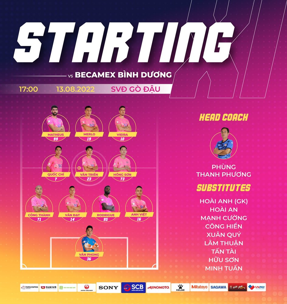 Sài Gòn FC: Văn Phong (thủ môn), Văn Đạt, Công Thành, Anh Việt, Văn Triền, Andre Vieira, Đỗ Merlo, Quốc Chí, Hồng Sơn, Rodrigue, Matheus Da Silva