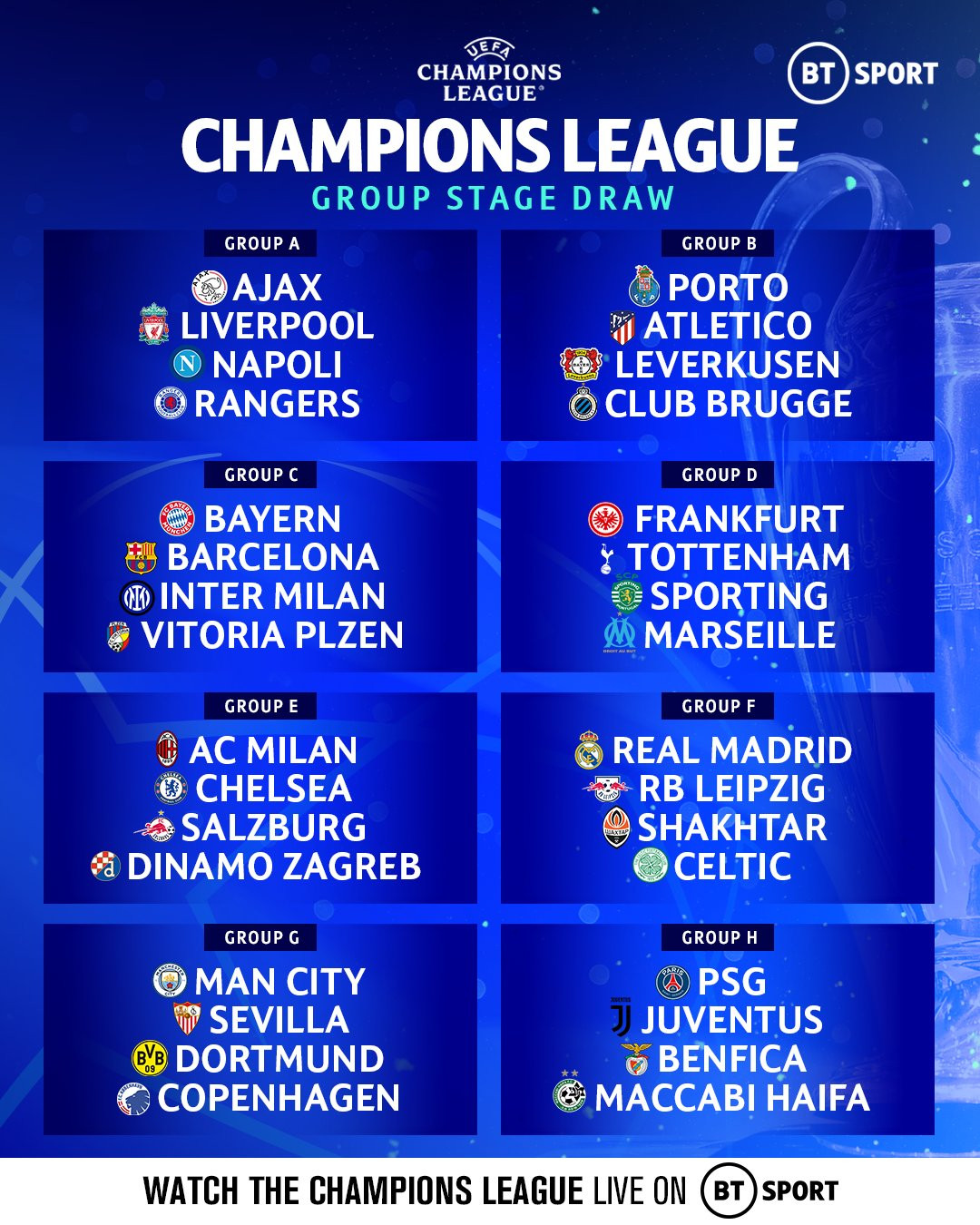 Nhóm 2: Liverpool, Chelsea, Barcelona, Juventus, Atletico, Sevilla, RB Leipzig, Tottenham.