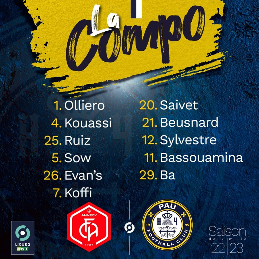 Annecy (3-5-2): Escales; Jean, Mouanga, Mendy; Billemaz, Demoncy, Kashi, Pajot, Lajugie; Bossetti, Farade.