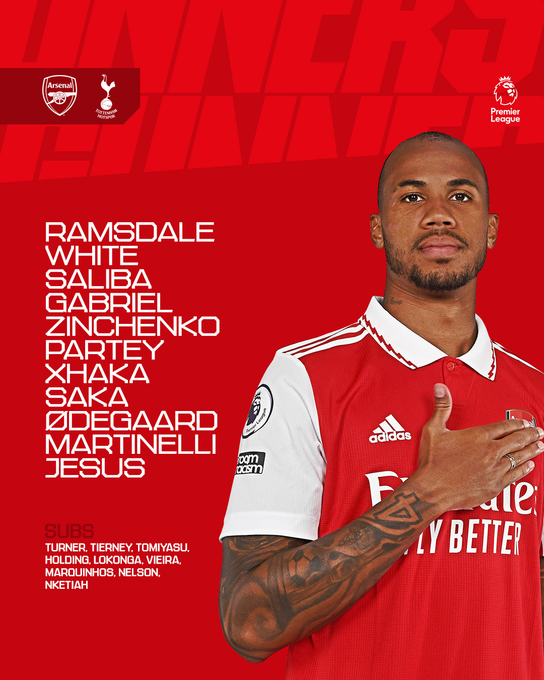 Bàn thắng (2-1, Gabriel Jesus): Saka đột phá rồi cứa lòng chân trái buộc Lloris phải đẩy bóng ra. Trung vệ Romero và thủ môn của Spurs phối hợp thiếu ăn ý để cho Gabriel Jesus dễ dàng đưa bóng vào lưới đội khách ở cự ly gần.