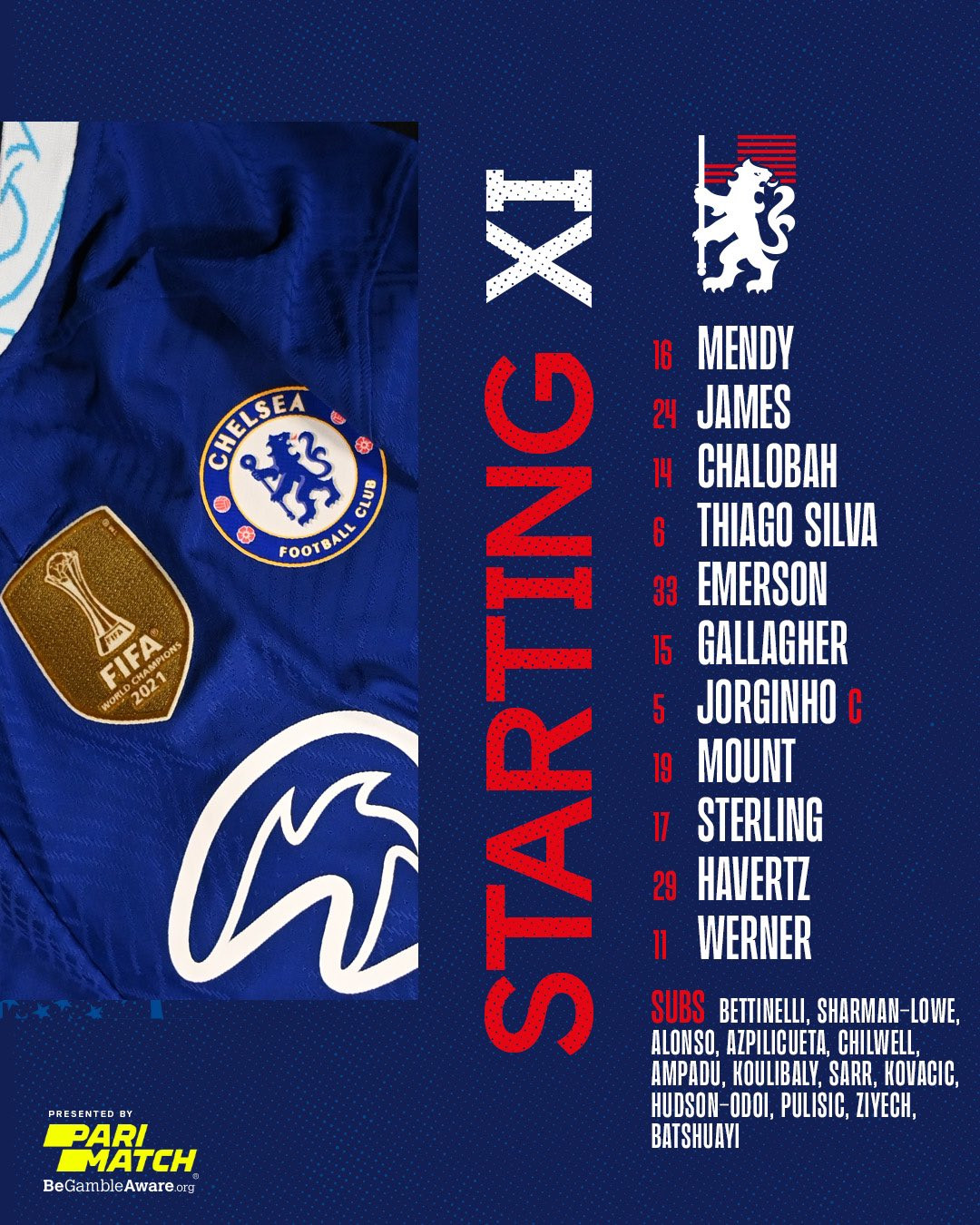 Chelsea: Mendy; Chalobah, Silva, Emerson; James, Jorginho, Gallagher, Mount; Werner, Havertz, Sterling.