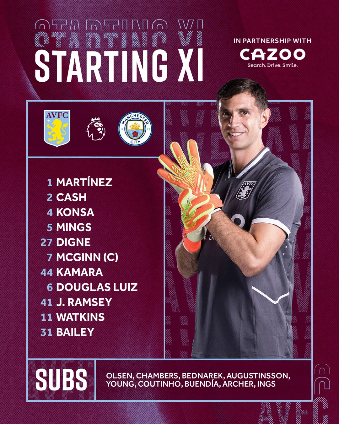 Aston Villa: Emiliano Martinez, Digne, Mings, Konsa, Cash, Douglas Luiz, Kamara, McGinn, Ramsey, Bailey, Watkins.