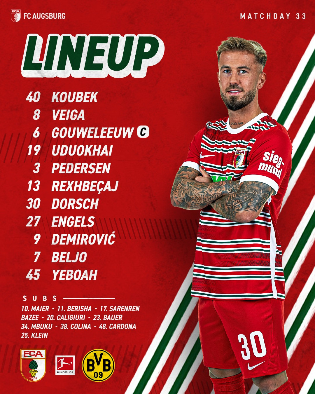 Augsburg (3-4-3): Koubek; Palma Veiga, Gouweleeuw, Uduokhai, Arne Engels, Niklas Dorsch, Rexhbecaj, Pedersen (David Colina 46'), Yeboah (Bauer 40'), Drena Beljo, Demirovic