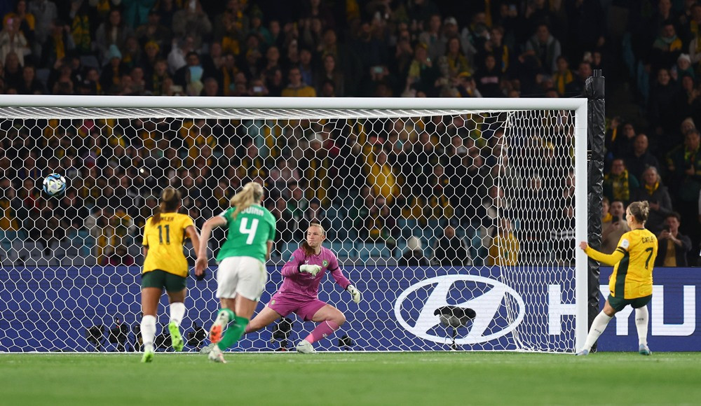 Marissa Sheva bên phía Ireland phạm lỗi với Hayley Raso trong vòng cấm đội nhà. Sau khi check VAR, trọng tài cho nữ Australia được hưởng quả phạt đền. Từ chấm 11m, Steph Catley không bỏ lỡ cơ hội mở tỉ số cho đội chủ nhà.