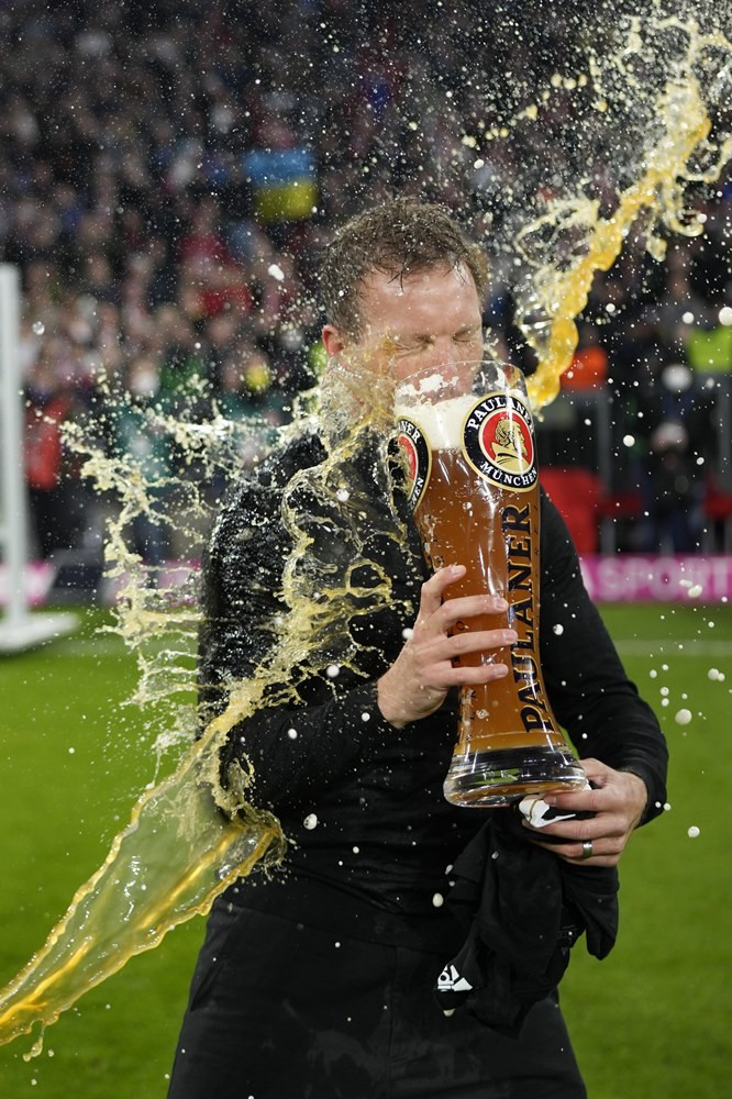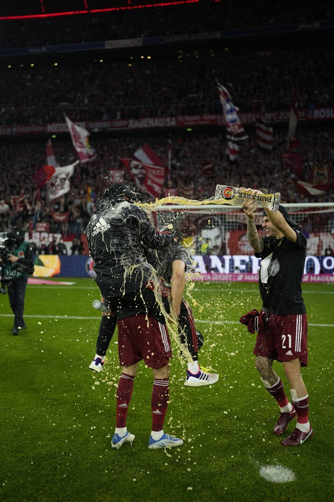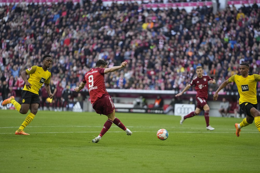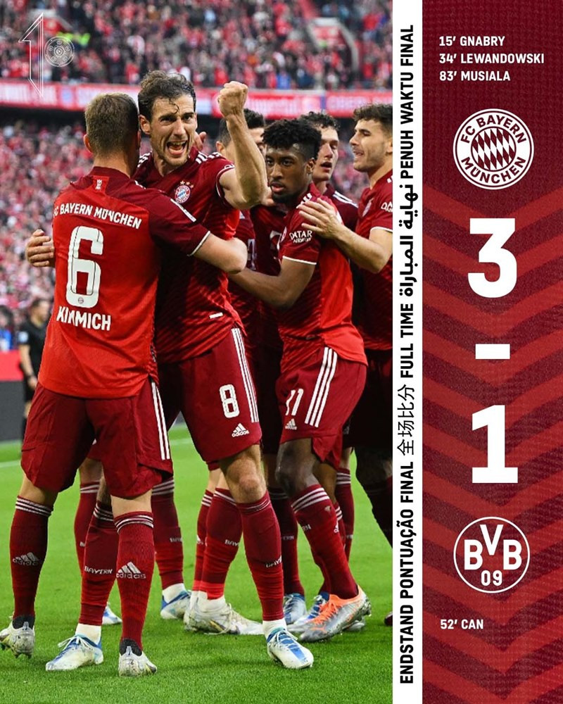 Dù phải làm khách nhưng Dortmund tự tin chơi áp sát khiến Bayern Munich gặp khó khăn trong những phút đầu tiênTừ một tình huống phạt góc ở phút 15, Goretzka đánh chiến thuật để Gnabry bắt vô-lê đẹp mắt mở tỷ số cho đội chủ nhàLewandowski tiếp tục gây nỗi ác mộng cho đội bóng cũ bằng pha ghi bàn nhân đôi cách biệt ở phút 34Tiền đạo người Ba Lan không ngừng ghi bàn cho "Hùm xám"Dortmund nỗ lực và được đền đáp bằng bàn gỡ của Emre Can trên chấm 11m ở phút 52Musiala chấm dứt mọi hi vọng của đội bóng vùng Ruhr bằng bàn thắng đẹp mắt ở phút 83Niềm vui của tài năng trẻ MusialaChiến thắng ấn tượng 3-1 trước Dortmund giúp Bayern Munich chính thức vô địch Bundesliga lần thứ 10 liên tiếp sớm 3 vòng đấu. "Húm xám" hiện đã hơn đội xếp thứ hai là chính Dortmund tới 12 điểm, trong khi mùa giải chỉ còn 3 vòng là hạ mànNiềm vui của thủ thành NeuerChức vô địch Bundesliga lần thứ 10 liên tiếp và là lần thứ 32 trong lịch sử Bayern Munich