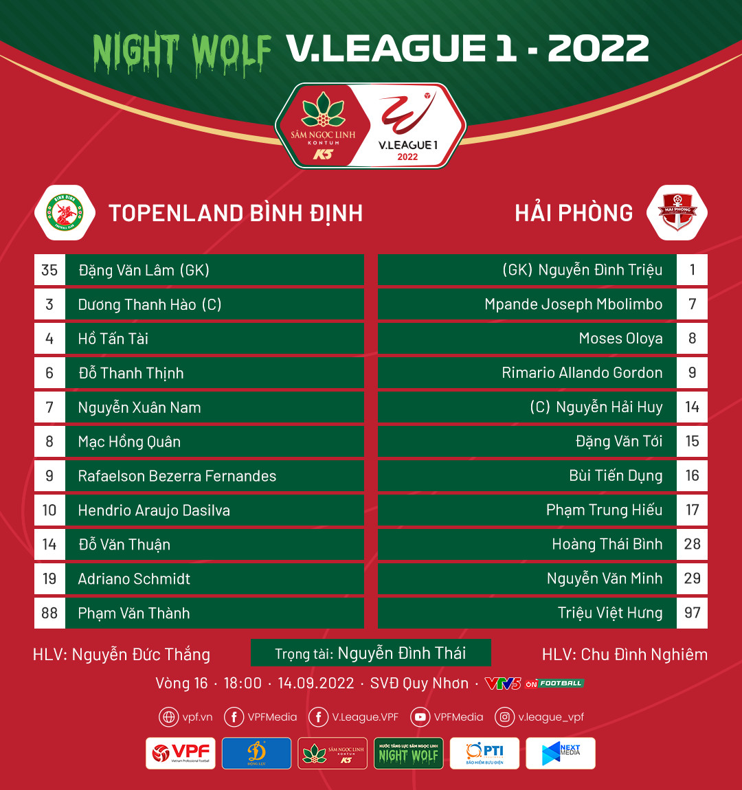 Bình Định: Văn Lâm (thủ môn), Tấn Tài, Adriano Schmidt, Thanh Hào (Đình Trọng 33'), Thanh Thịnh, Hendrio, Văn Thành, Văn Thuận, Xuân Nam, Hồng Quân, Rafaelson