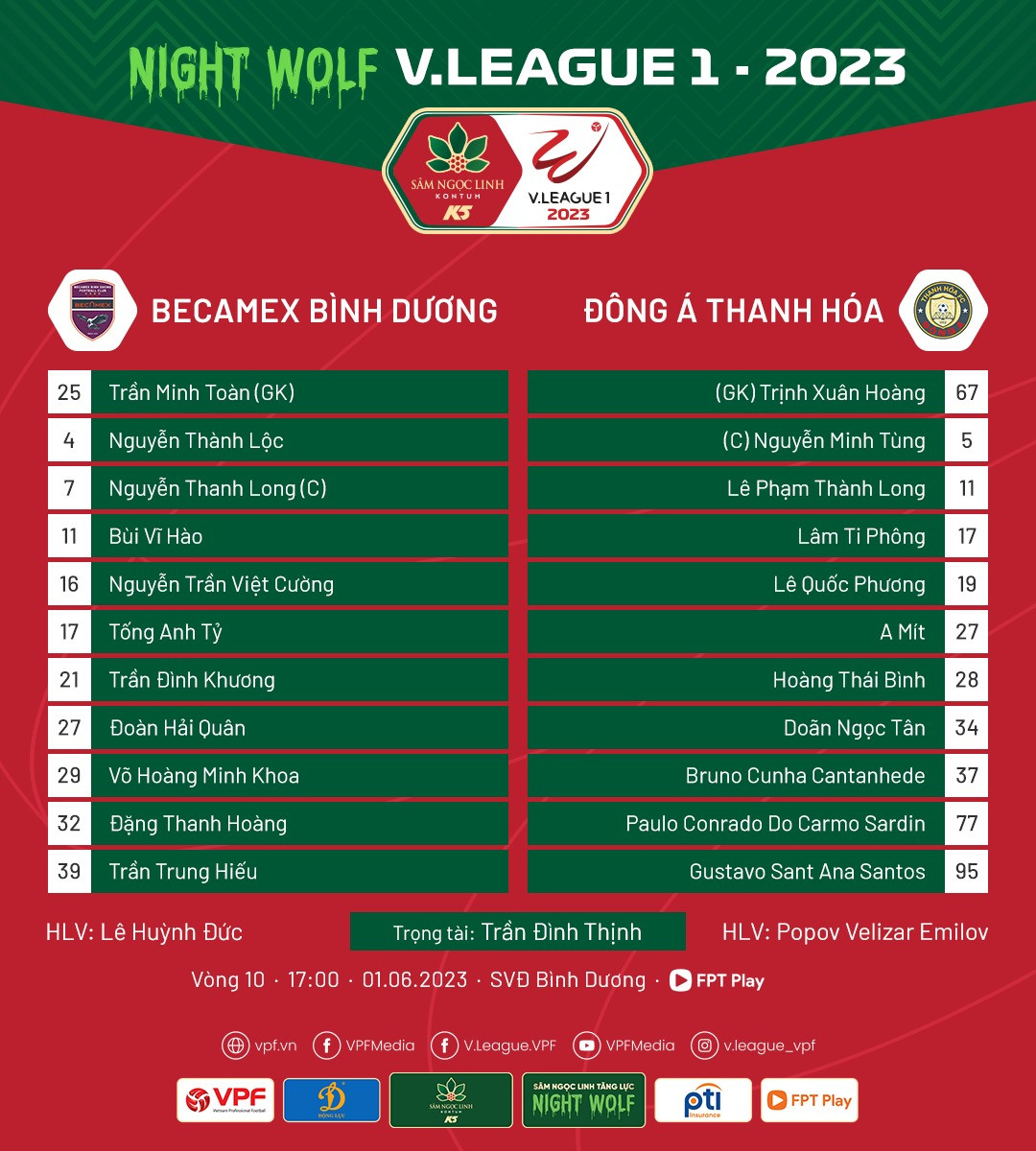 Bình Dương: Minh Toàn (25), Thanh Long (7), Thanh Hoàng (32), Đình Khương (21), Thành Lộc (4), Trung Hiếu (39), Anh Tỷ (17), Hải Quân (Tự Nhân 73'), Minh Khoa (Tiến Linh 73'), Việt Cường (16), Vĩ Hào (11).