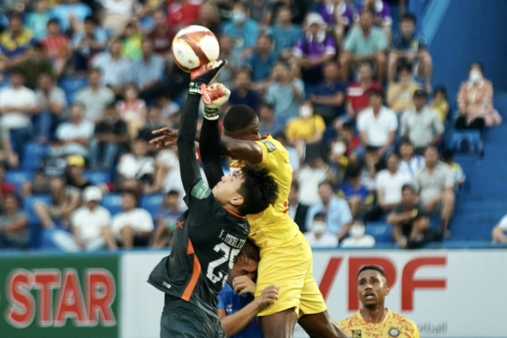 Thủ môn Minh Toàn bên phía Bình Dương có hai pha cản phá xuất sắc trước những cú dứt điểm của Thái Bình và Gustavo Santos trong vòng cấm.