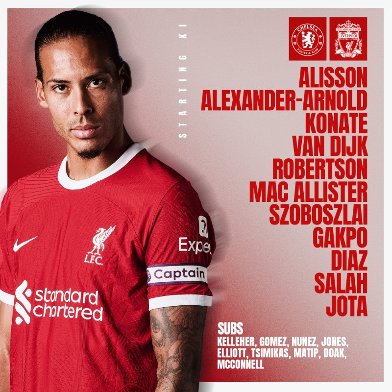 Liverpool: Alisson; Alexander-Arnold, Konate, Van Dijk, Robertson; Mac Allister, Szoboszlai; Salah, Gakpo, Jot, Diaz.