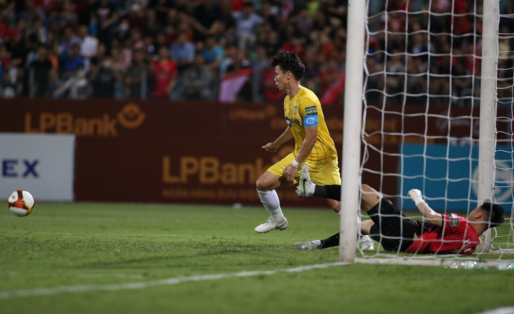 Đón quả treo bóng từ cánh phải vào của Hồ Tấn Tài, Lê Văn Đô tung người bắt vô-lê kiểu cắt kéo ở sát vạch 16m50, gỡ hòa 1-1 cho CAHN.