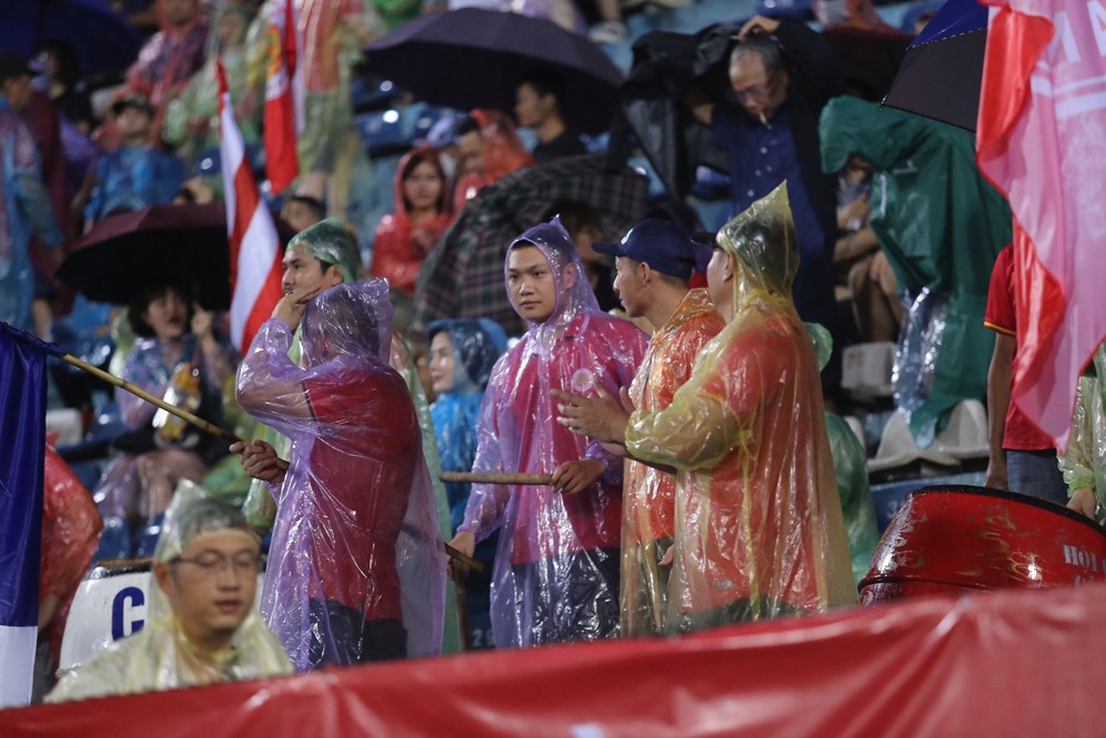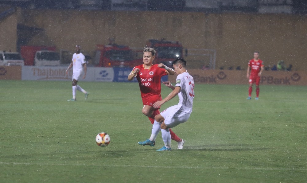 Mưa tiếp tục trút xuống sân Hàng Đẫy ảnh hưởng đáng kể đến lối chơi của hai đội.
