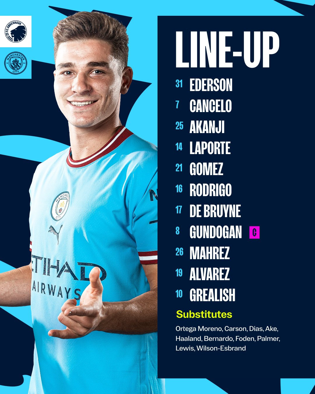 Man City: Ederson; Cancelo, Akanji, Laporte, Gomez; Rodri, Gundogan, De Bruyne; Grealish, Alvarez, Mahrez.