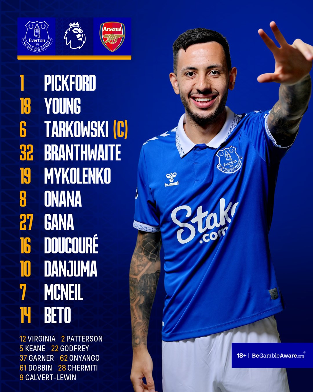 Everton: Pickford; Mykolenko, Tarkowski, Branthwaite, Young; Onana, Gueye; McNeil, Doucoure, Danjuma; Beto.