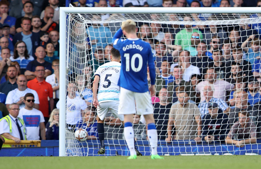 Từ khoảng cách 11m, Jorginho dễ dàng đánh lừa Pickford mở tỷ số cho Chelsea.