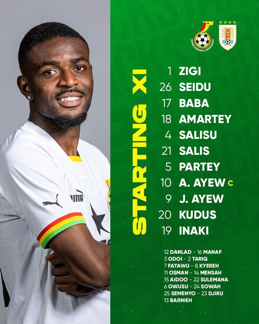 Ghana (4-2-3-1): Ati Zigi; Seidu, Amartey, Salisu, Baba Rahman; Abdul Samed, Thomas; Kudus, A. Ayew, J. Ayew; Williams.
