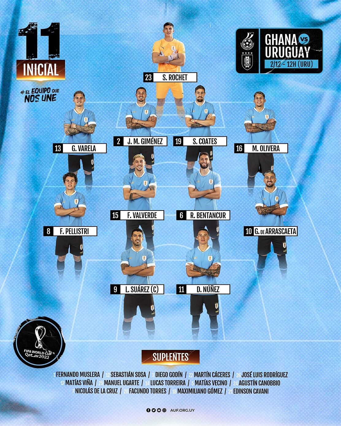 Uruguay (4-4-2): Rochet; Varela, Gimenez, Coates, Olivera; Pellistri, Betancur, Valverde, Arrascaeta; Luis Suarez, Darwin Nunez.