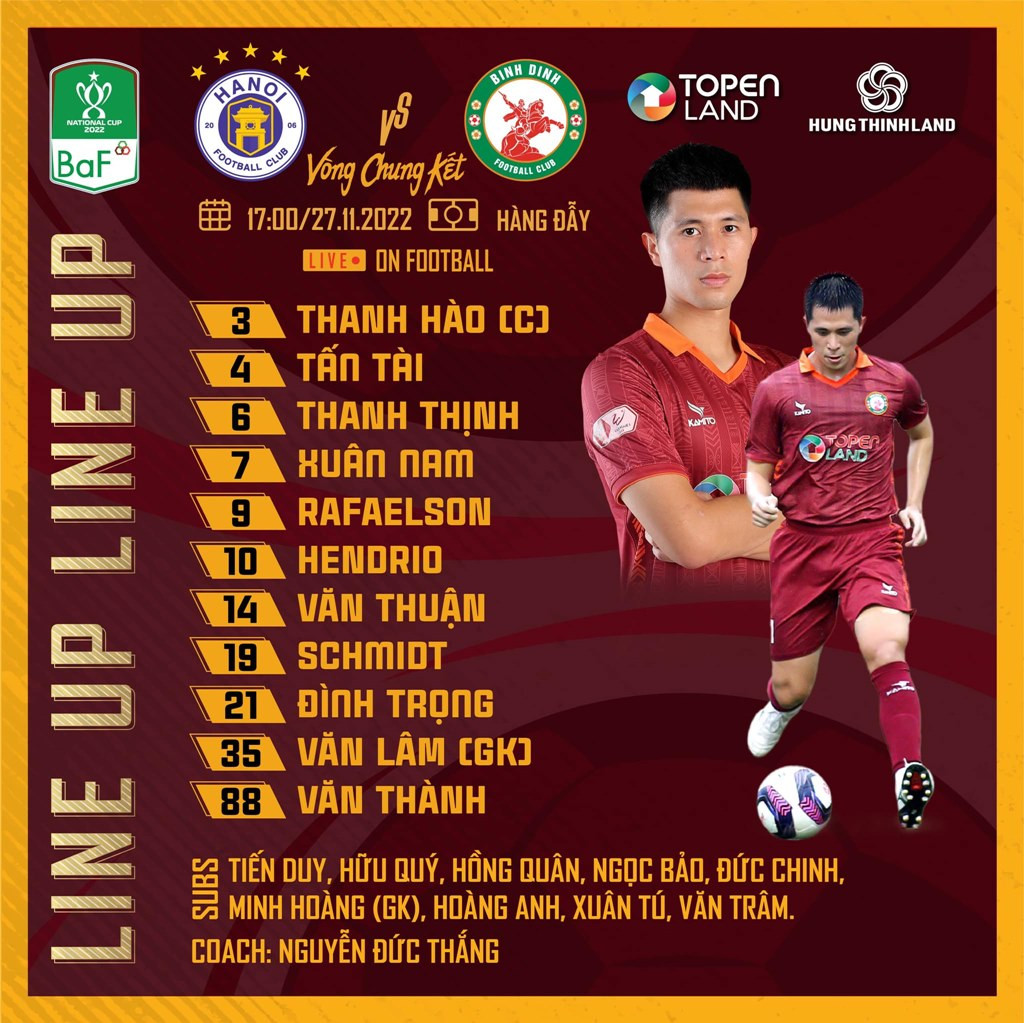 Bình Định: Văn Lâm (thủ môn), Tấn Tài, Schmidt, Đình Trọng, Xuân Nam, Thanh Thịnh, Văn Thuận, Văn Thành, Hendrio, Thanh Hào, Rafaelson.