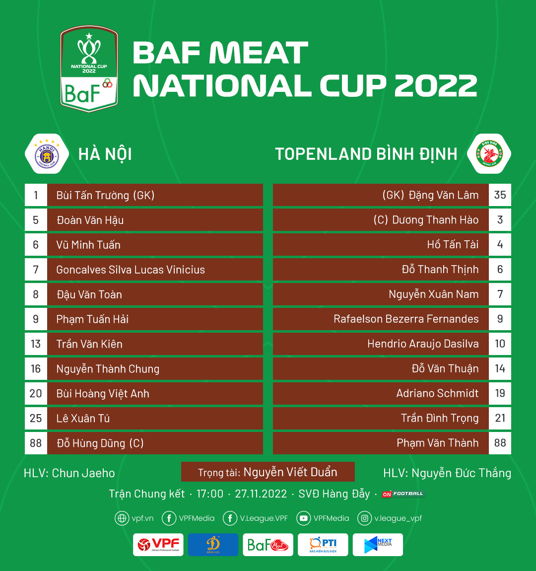 Hà Nội FC: Tấn Trường (thủ môn), Văn Hậu, Việt Anh, Thành Chung, Văn Kiên, Minh Tuấn, Xuân Tú, Văn Toàn, Hùng Dũng, Lucao, Tuấn Hải.
