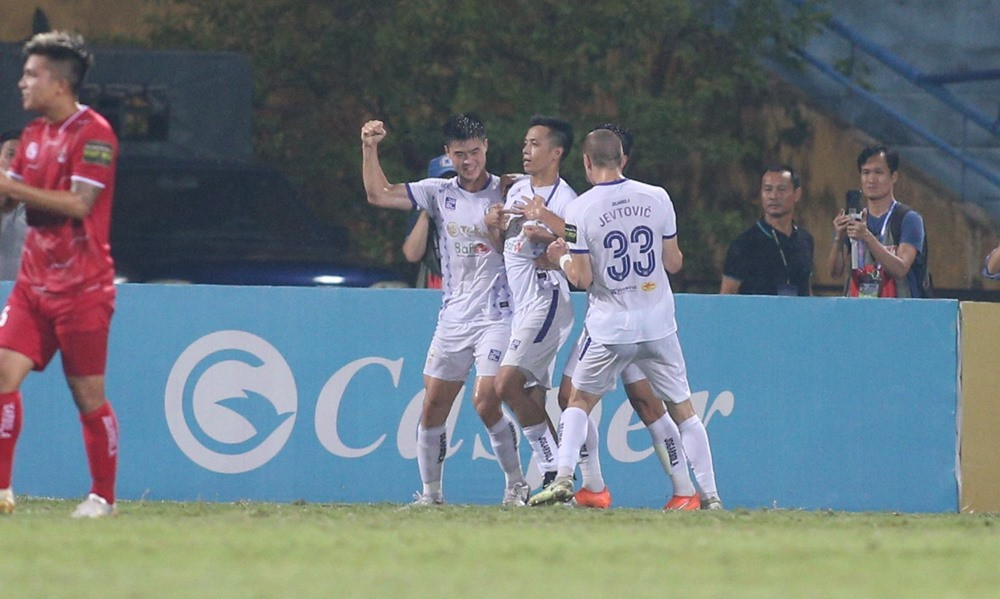 Các học trò của HLV Chu Đình Nghiêm nỗ lực gây sức ép để tìm kiếm bàn thắng quân bình tỉ số nhưng không dễ hóa giải hàng phòng ngự của Hà Nội FC.