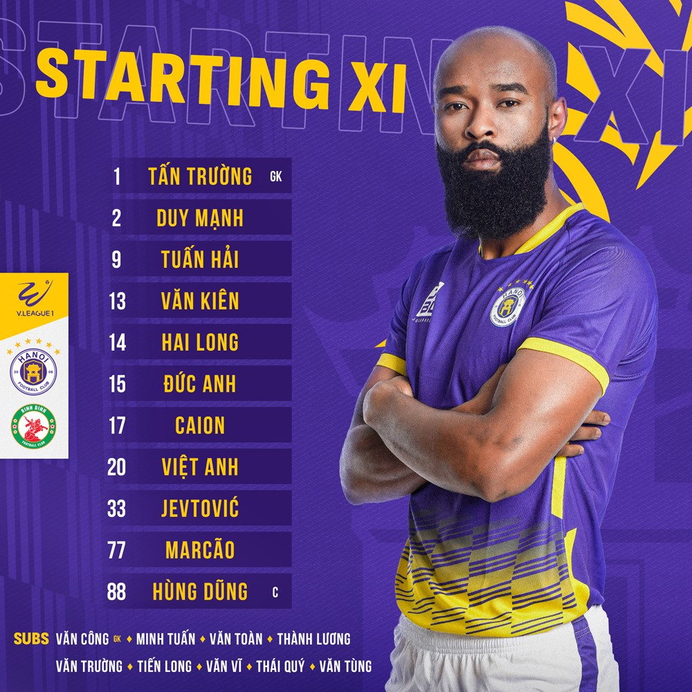 Hà Nội FC: Tấn Trường (1), Văn Kiên (13), Duy Mạnh (2), Việt Anh (20), Đức Anh (15), Hai Long (14), Hùng Dũng (88), Tuấn Hải (9), Marcao (77), Herlison Caion (17), Jevtovic Milan (33)
