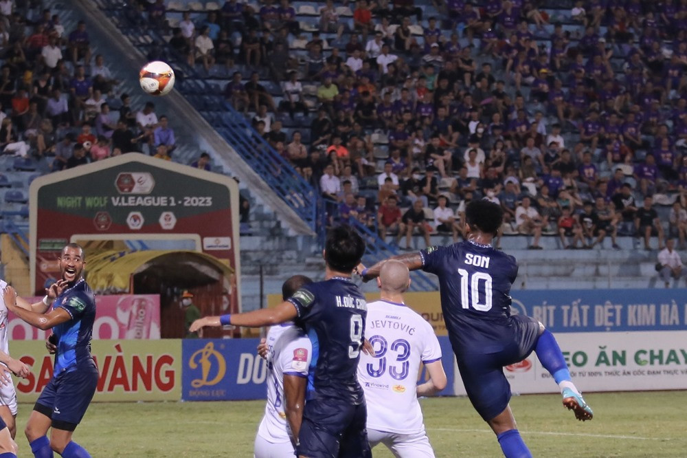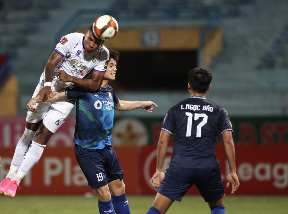 Từ tình huống cố định bên ngoài vòng cấm Hà Nội, Văn Thuận bấm bóng vào trong để Marlon Almeida đánh đầu đưa bóng đi vọt khung thành chủ nhà.