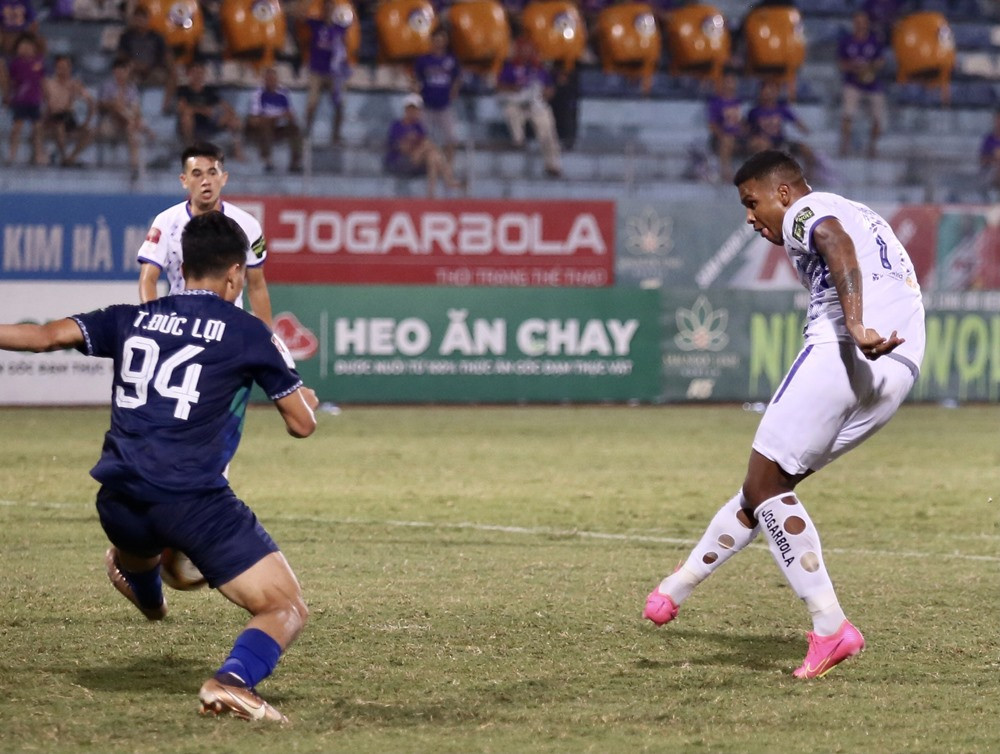 Ngay sau khi Rafaelson đánh đầu không thắng được thủ môn Tấn Trường, Mạc Hồng Quân sút căng như kẻ chỉ nhưng bóng bay vọt xà ngang khung thành Hà Nội.