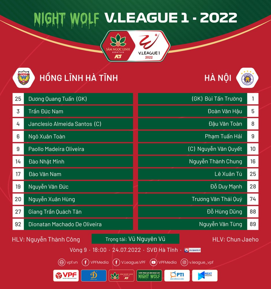 Hà Nội: Tấn Trường (thủ môn), Duy Mạnh, Thành Chung, Văn Hậu (Việt Anh 84'), Văn Toàn, Hùng Dũng, Văn Quyết, Thái Quý (Vũ Tiến Long 88'), Tuấn Hải, Xuân Tú (Tonci 56'), Văn Tùng (Siladji 56').