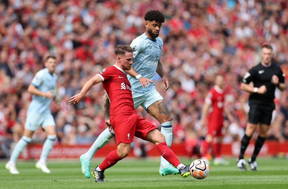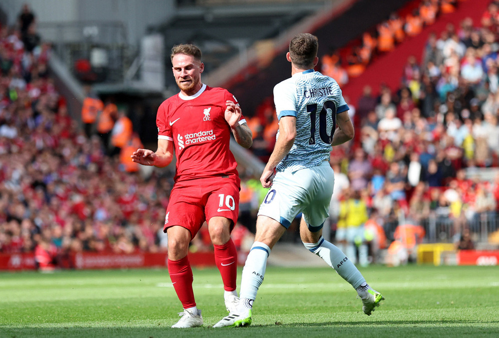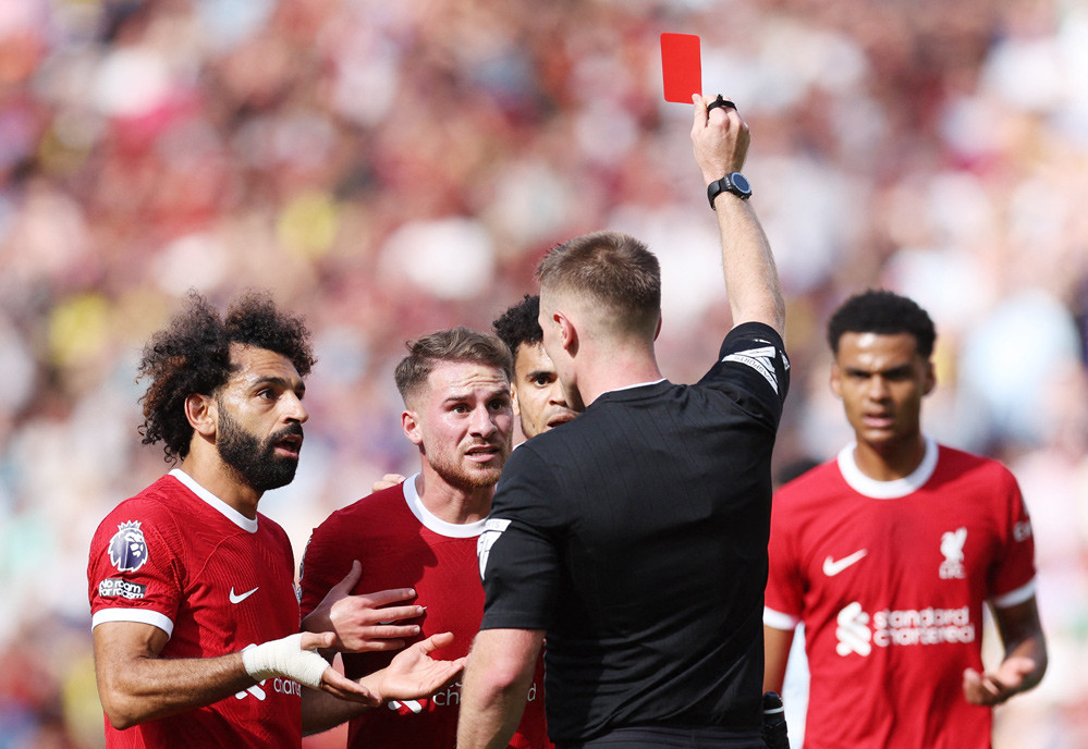Thẻ đỏ: Mac Allister phạm lỗi cực kỳ nguy hiểm với Christie và trọng tài chính lập tức rút thẻ đỏ truất quyền thi đấu tiền vệ của Liverpool.
