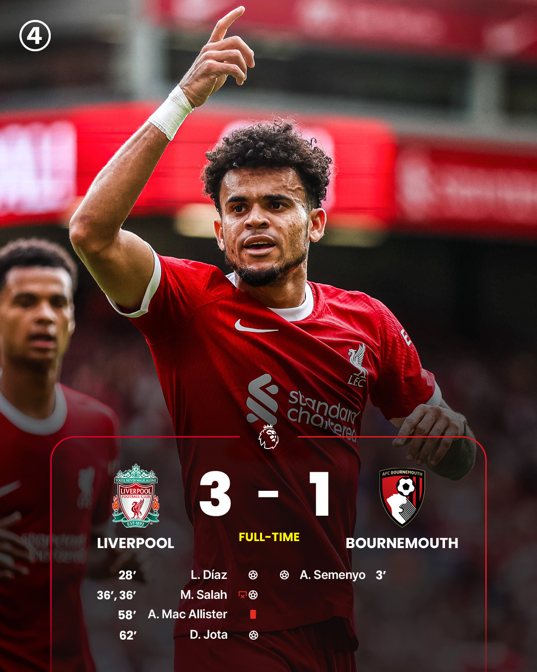 Bàn thắng: Luis Diaz 27', Salah 36' (pen), Jota 62' - Semenyo 3'