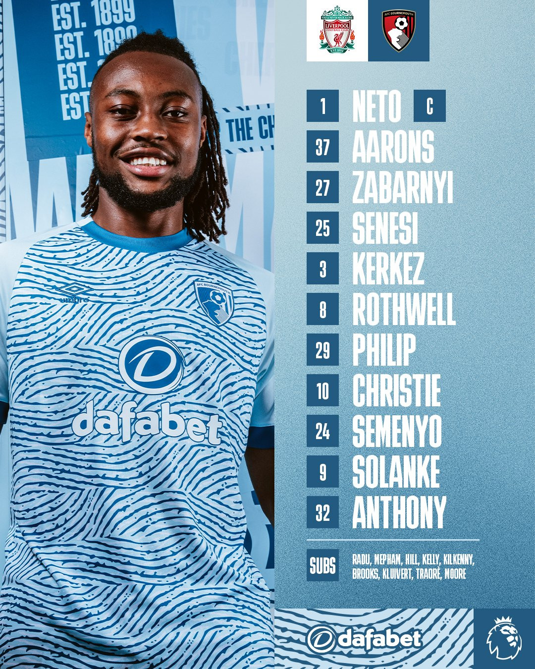 Bournemouth (4-2-3-1): Neto; Aarons, Zabarnyi, Senesi, Kerkez; Billing, Rothwell; Semenyo, Christie, Anthony; Solanke.