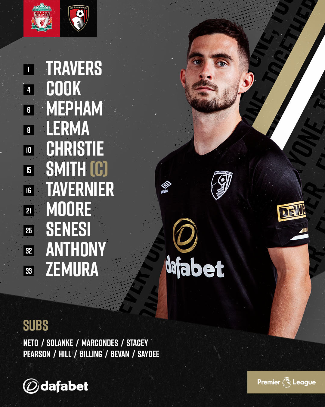 Bournemouth (3-4-2-1): Travers; Mepham, Lerma, Smith, Cook, Senesi, Zemura; Tavernier, Christie; Anthony, Moore.