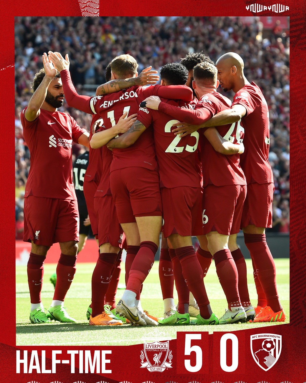 Bàn thắng: Luis Diaz 3', 85', Elliott 6', Alexander-Arnold 28', Firmino 31', 62', Van Dijk 45', Mepham 46' (phản lưới), Fabio Carvalho 80'