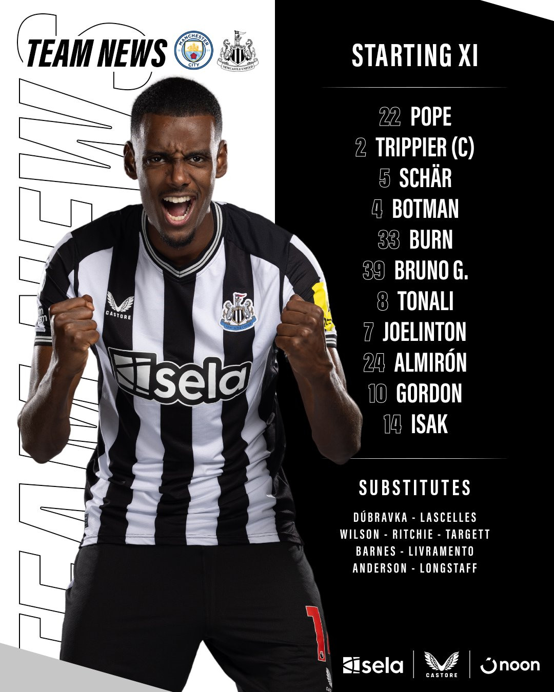 Newcastle (4-3-3): Pope; Trippier, Schar, Botman, Burn; Tonali, Guimaraes, Joelinton; Almiron, Isak, Gordon.