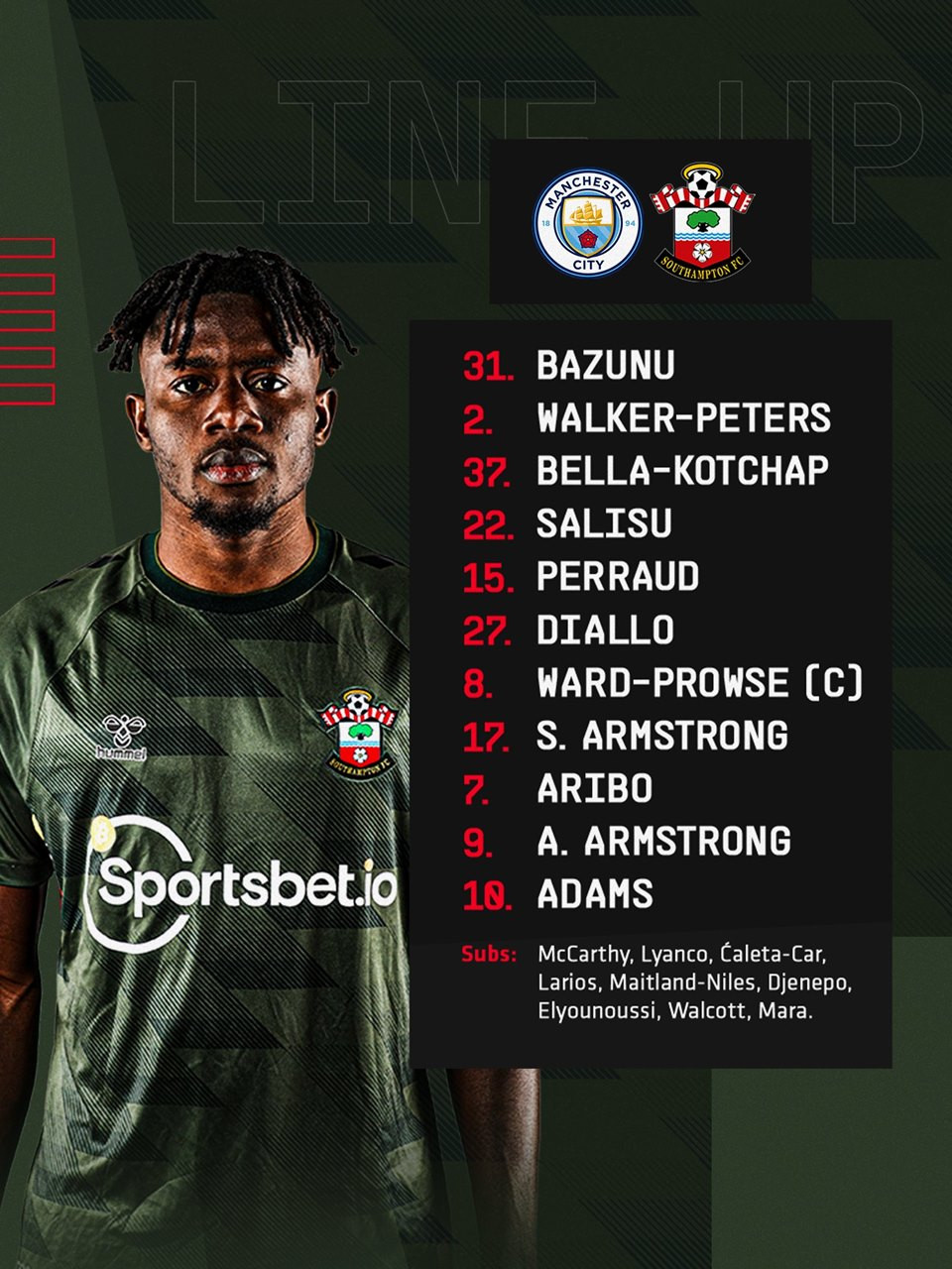 Southampton (4-4-2): Gavin Bazunu (31), Kyle Walker-Peters (2), Mohammed Salisu (22), Armel Bella-Kotchap (37), Romain Perraud (15), Stuart Armstrong (17), James Ward-Prowse (8), Ibrahima Diallo (27), Joe Aribo (7), Adam Armstrong (9), Che Adams (10)