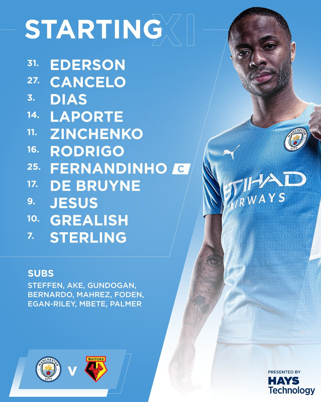 Man City (4-3-3): Ederson, Cancelo, Dias, Laporte, Zinchenko, Rodrigo, Fernandinho (C), De Bruyne, Jesus, Grealish, Sterling.